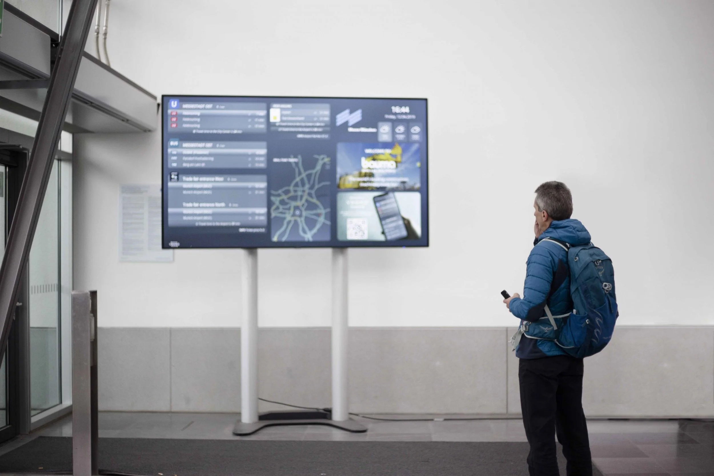 Abfahrtsmonitore: Abfahrts- oder Mobilitäts-Informations-Monitore in den Eingangsbereichen (u.a. Widgets mit Informationen zur nächsten Abfahrt des ÖV)